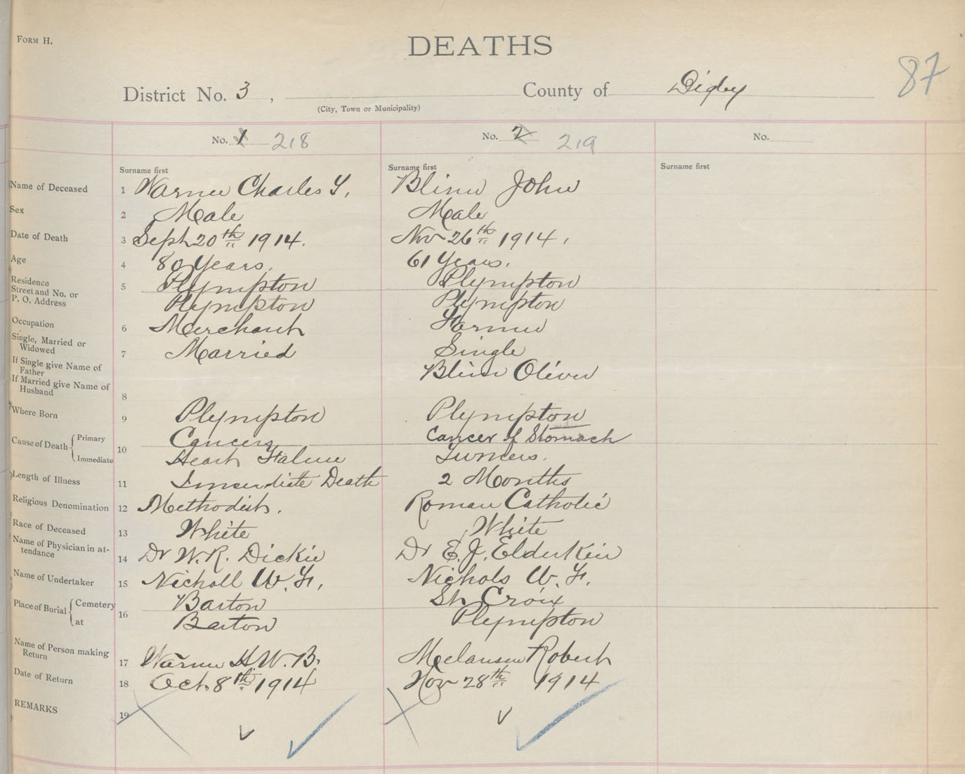 Male Death Registration: Year: 1914 book: 33 page: 87 number: 219