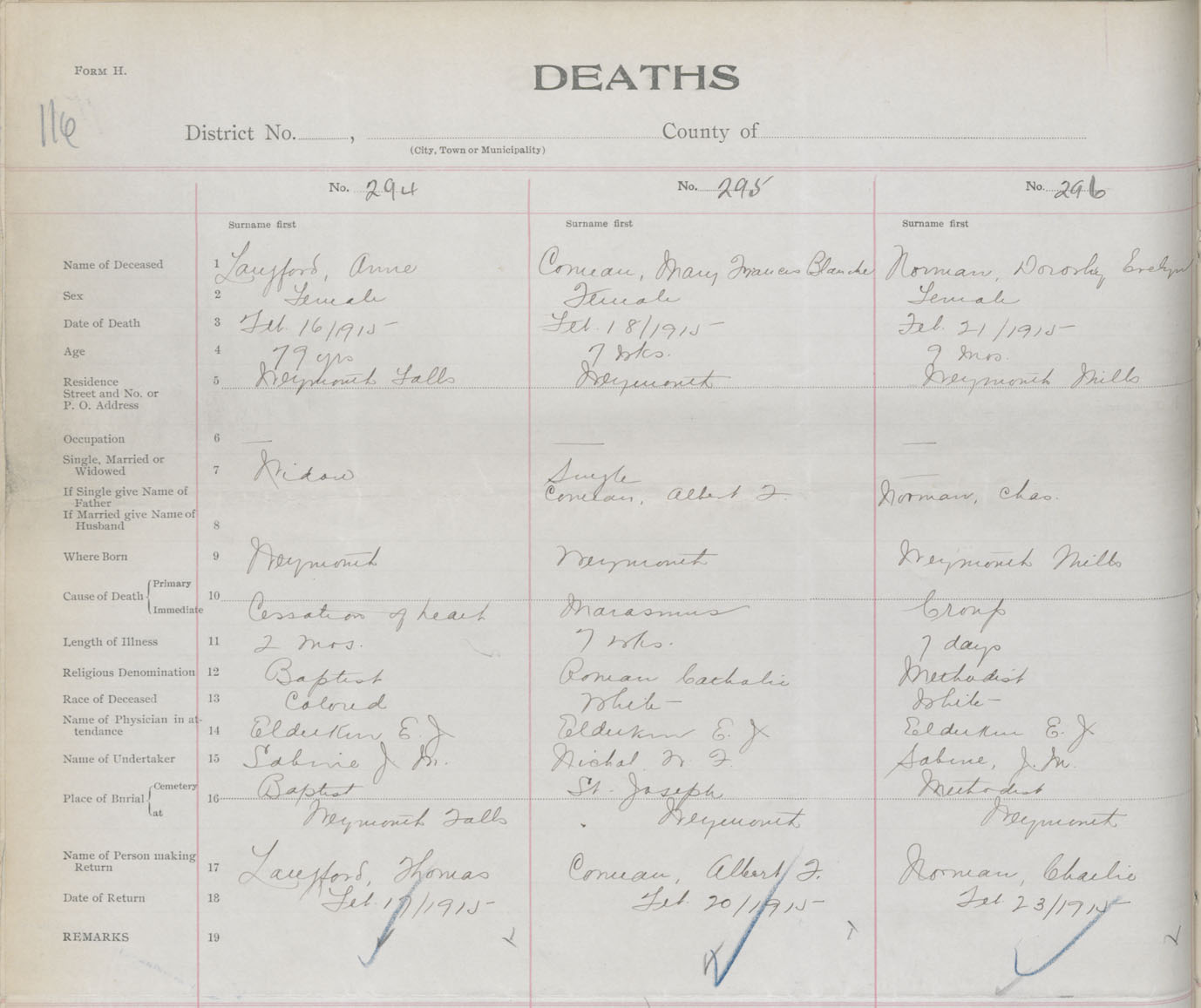 Female Death Registration: Year: 1915 book: 33 page: 116 number: 296