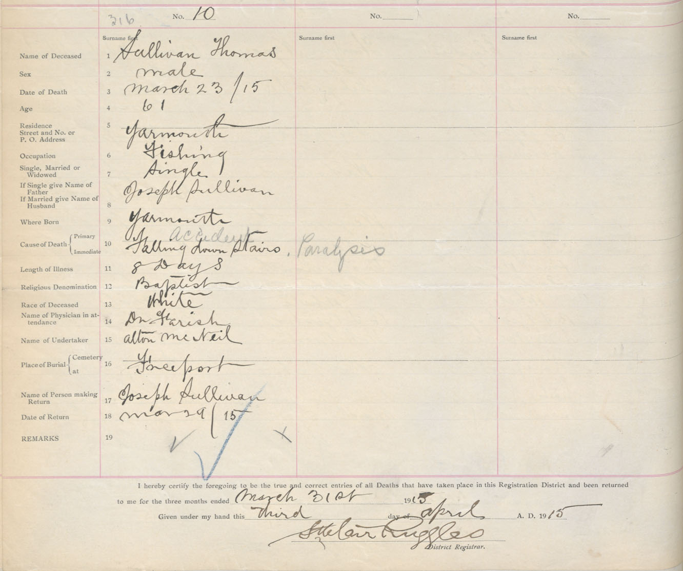 Male Death Registration: Year: 1915 book: 33 page: 122 number: 316