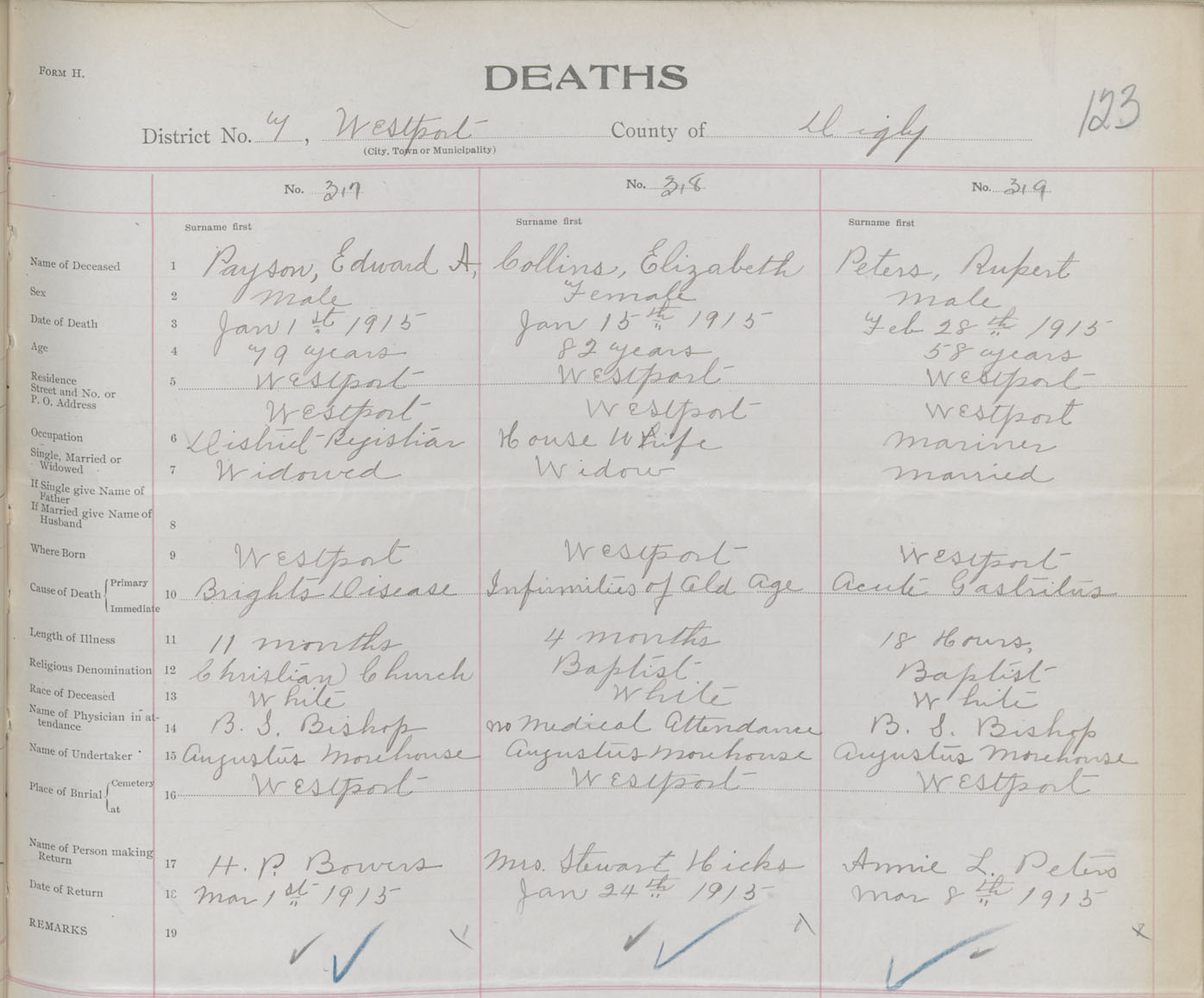 Male Death Registration: Year: 1915 book: 33 page: 123 number: 319