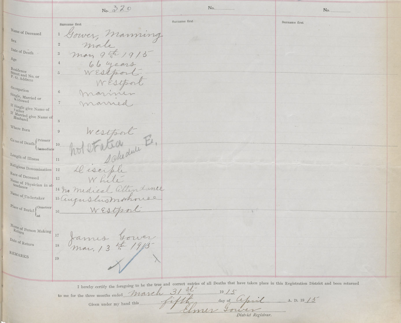 Male Death Registration: Year: 1915 book: 33 page: 123 number: 320