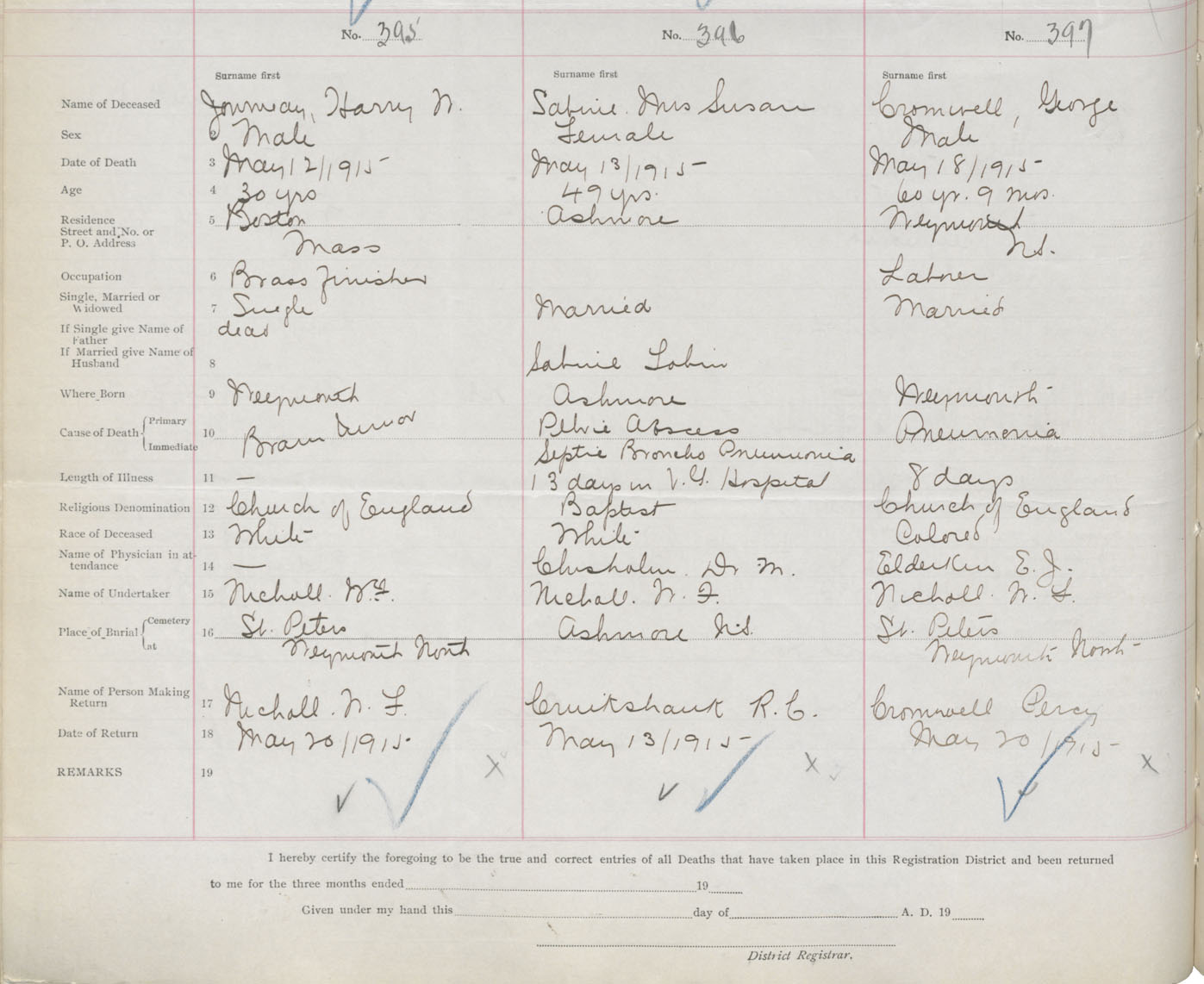 Male Death Registration: Year: 1915 book: 33 page: 146 number: 395