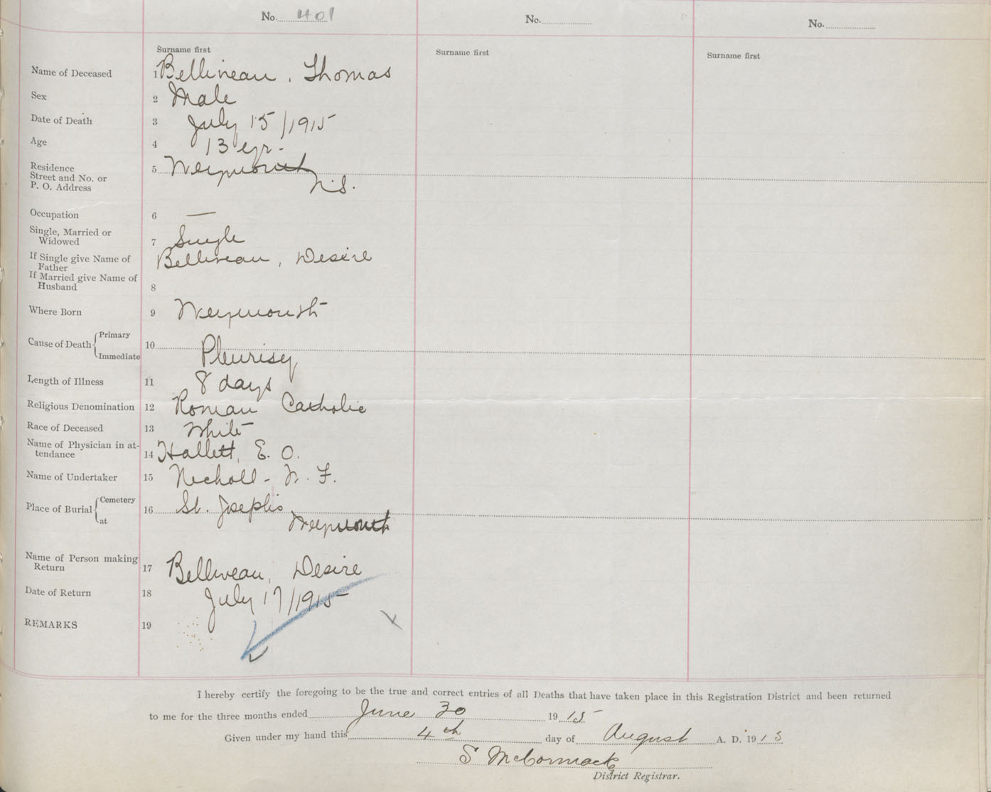 Male Death Registration: Year: 1915 book: 33 page: 147 number: 401