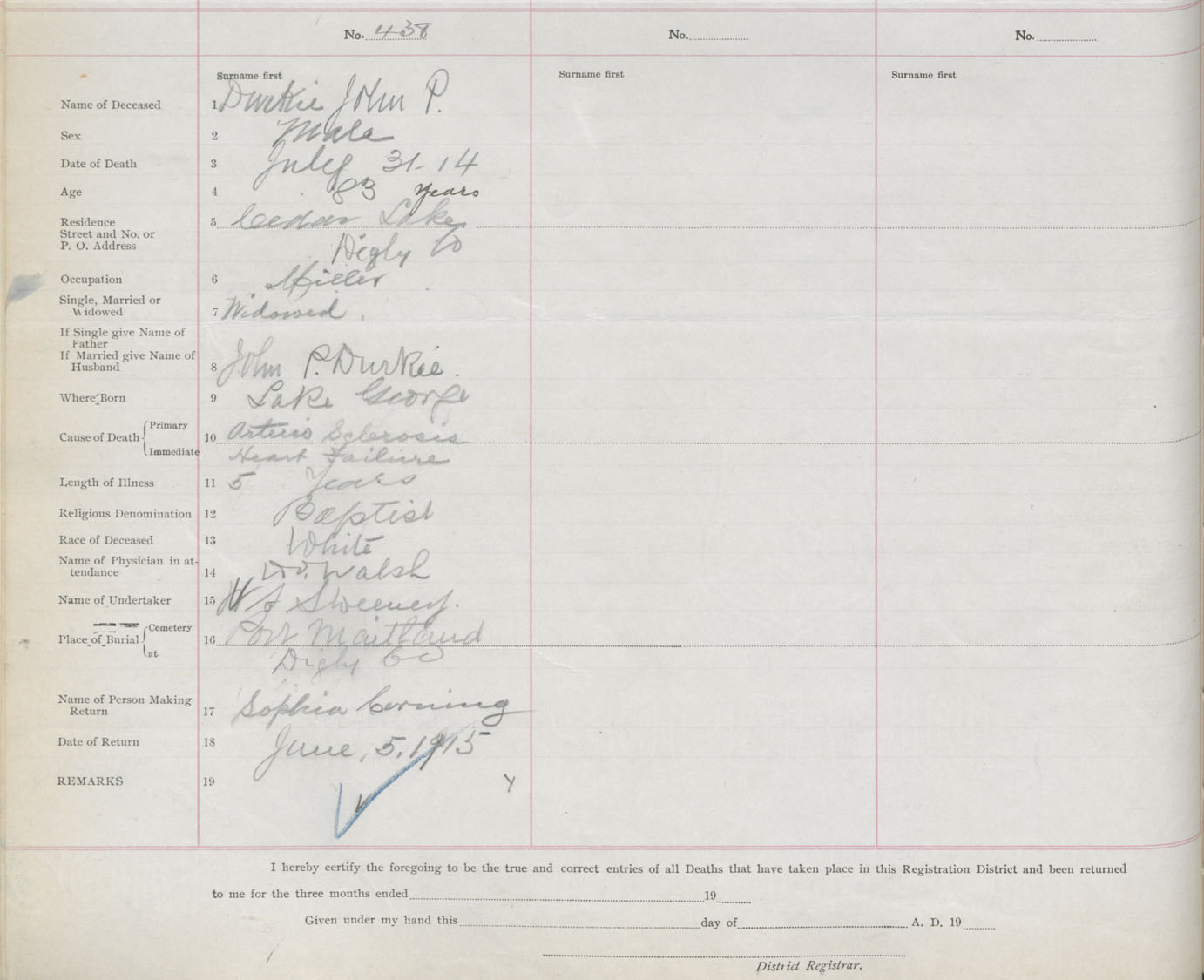 Male Death Registration: Year: 1914 book: 33 page: 166 number: 438