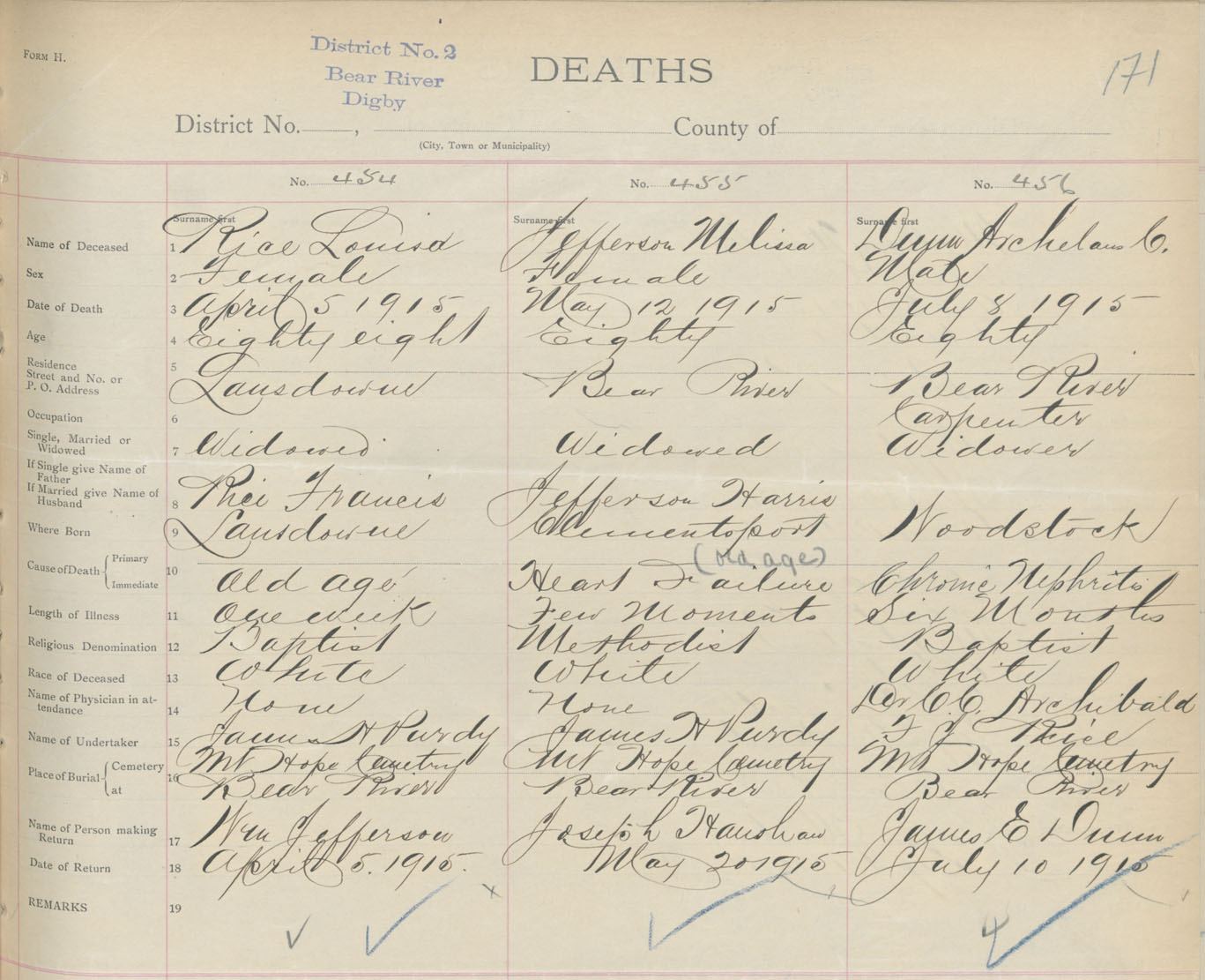 Female Death Registration: Year: 1915 book: 33 page: 171 number: 454
