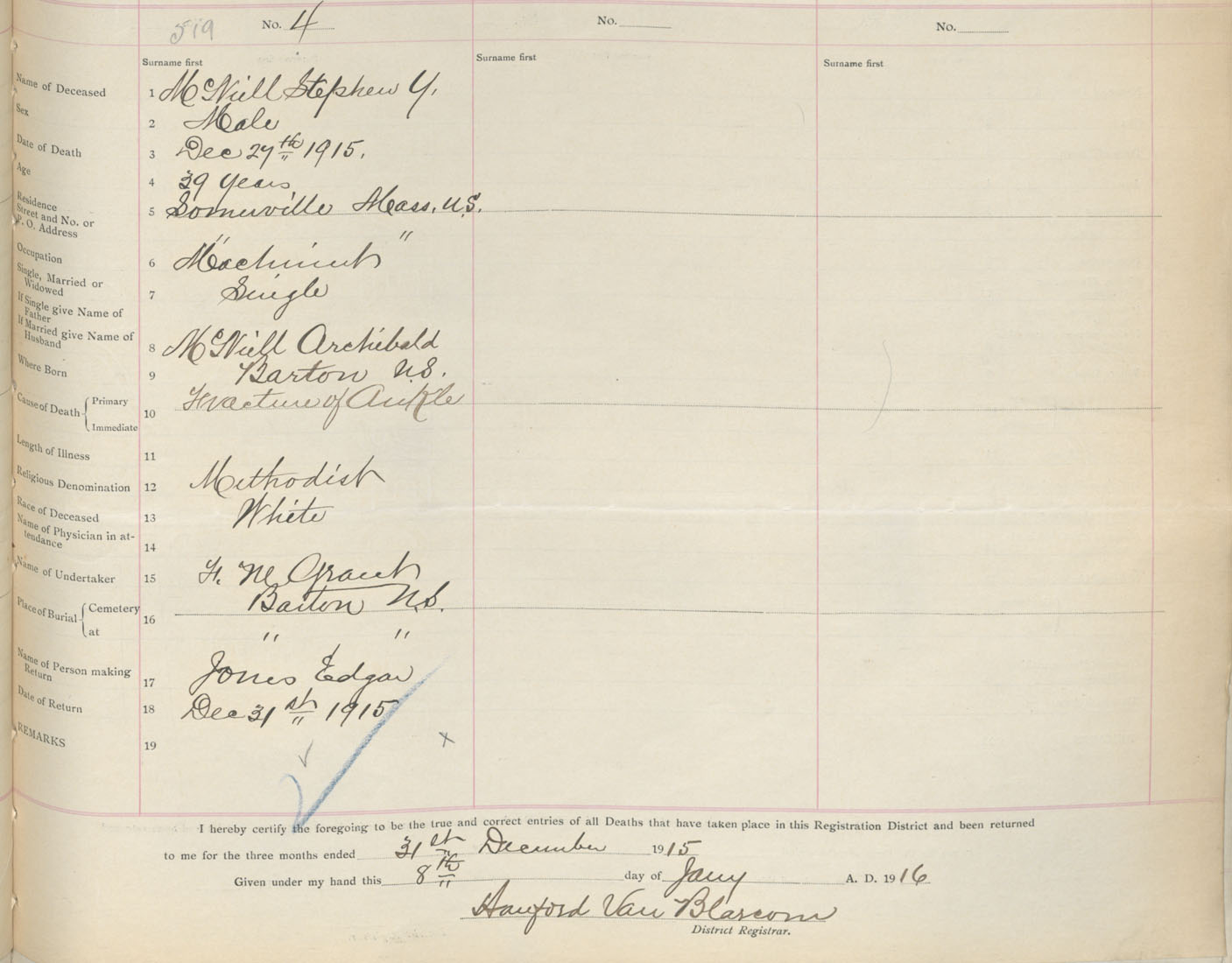 Male Death Registration: Year: 1915 book: 33 page: 197 number: 519