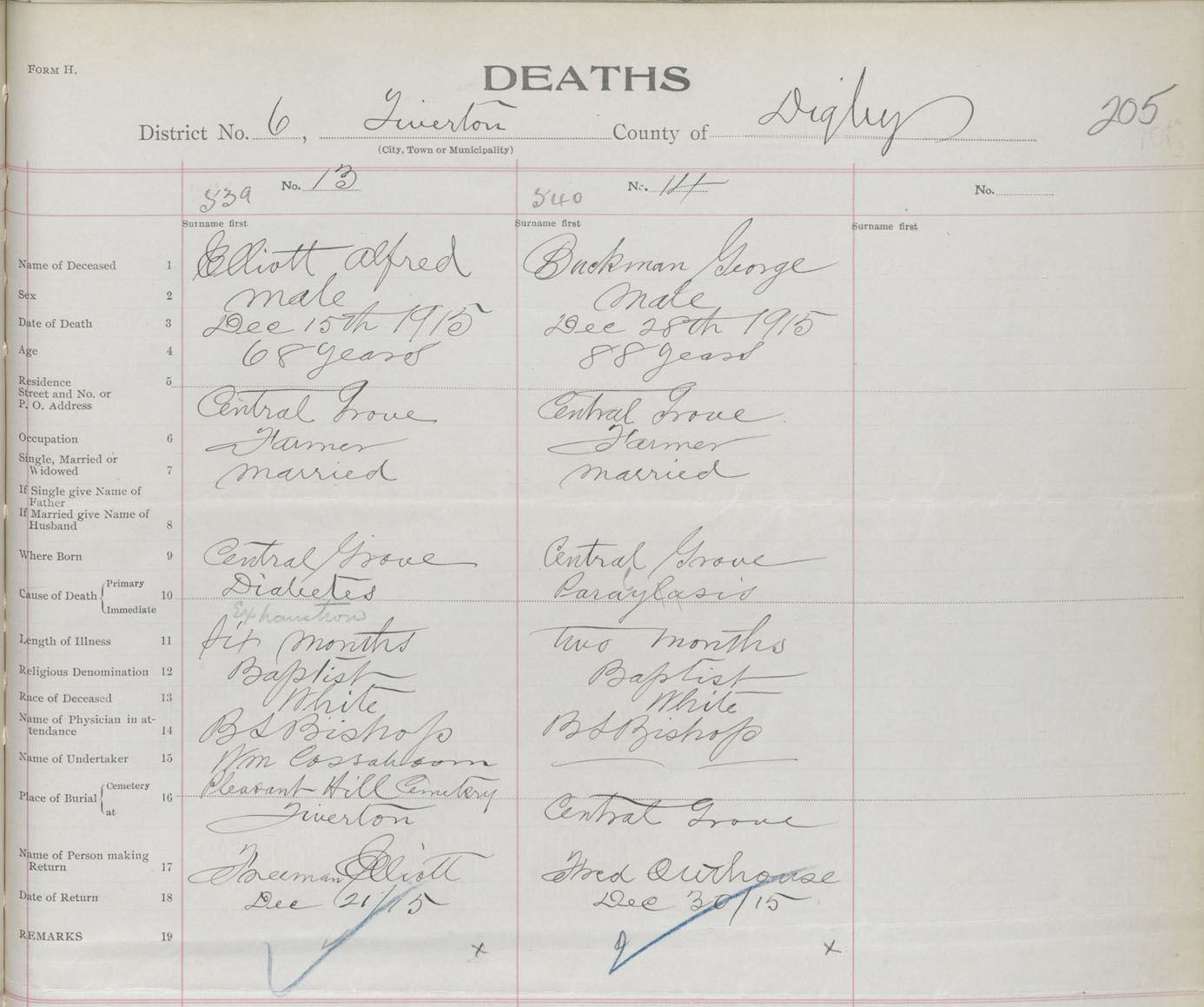 Male Death Registration: Year: 1915 book: 33 page: 205 number: 539