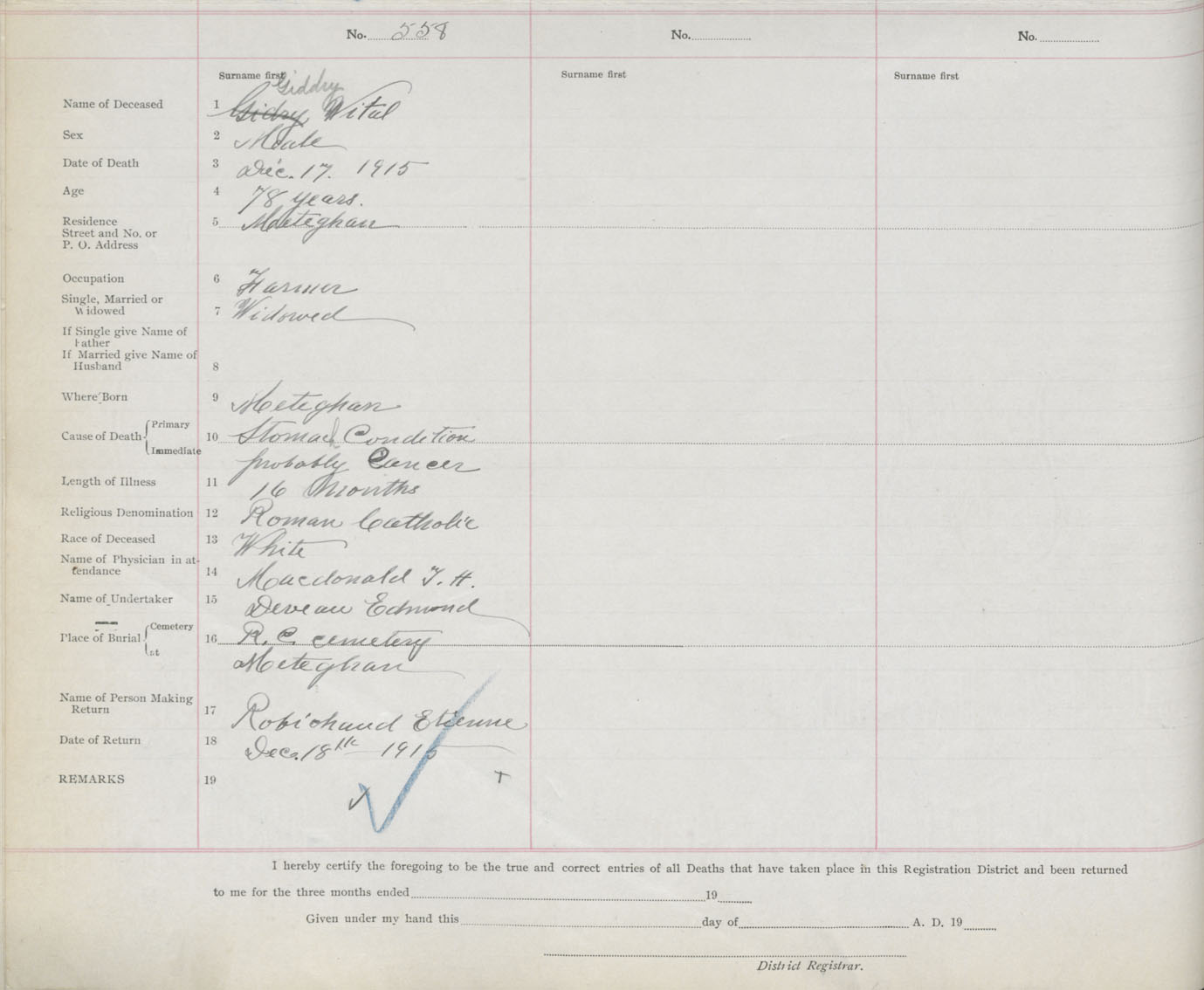 Male Death Registration: Year: 1915 book: 33 page: 216 number: 558