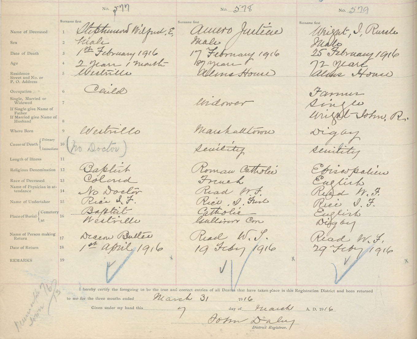 Male Death Registration: Year: 1916 book: 33 page: 222 number: 579