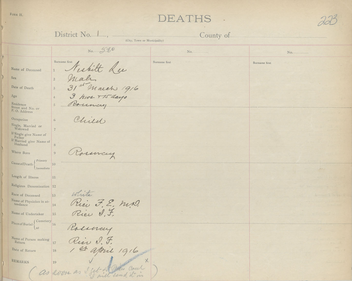 Male Death Registration: Year: 1916 book: 33 page: 223 number: 580
