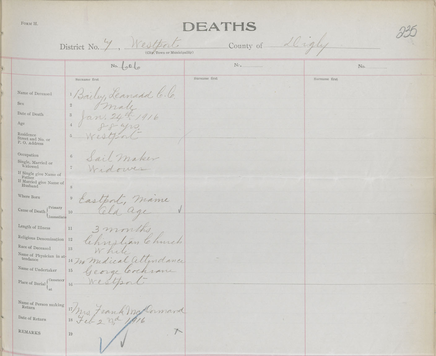 Male Death Registration: Year: 1916 book: 33 page: 235 number: 606