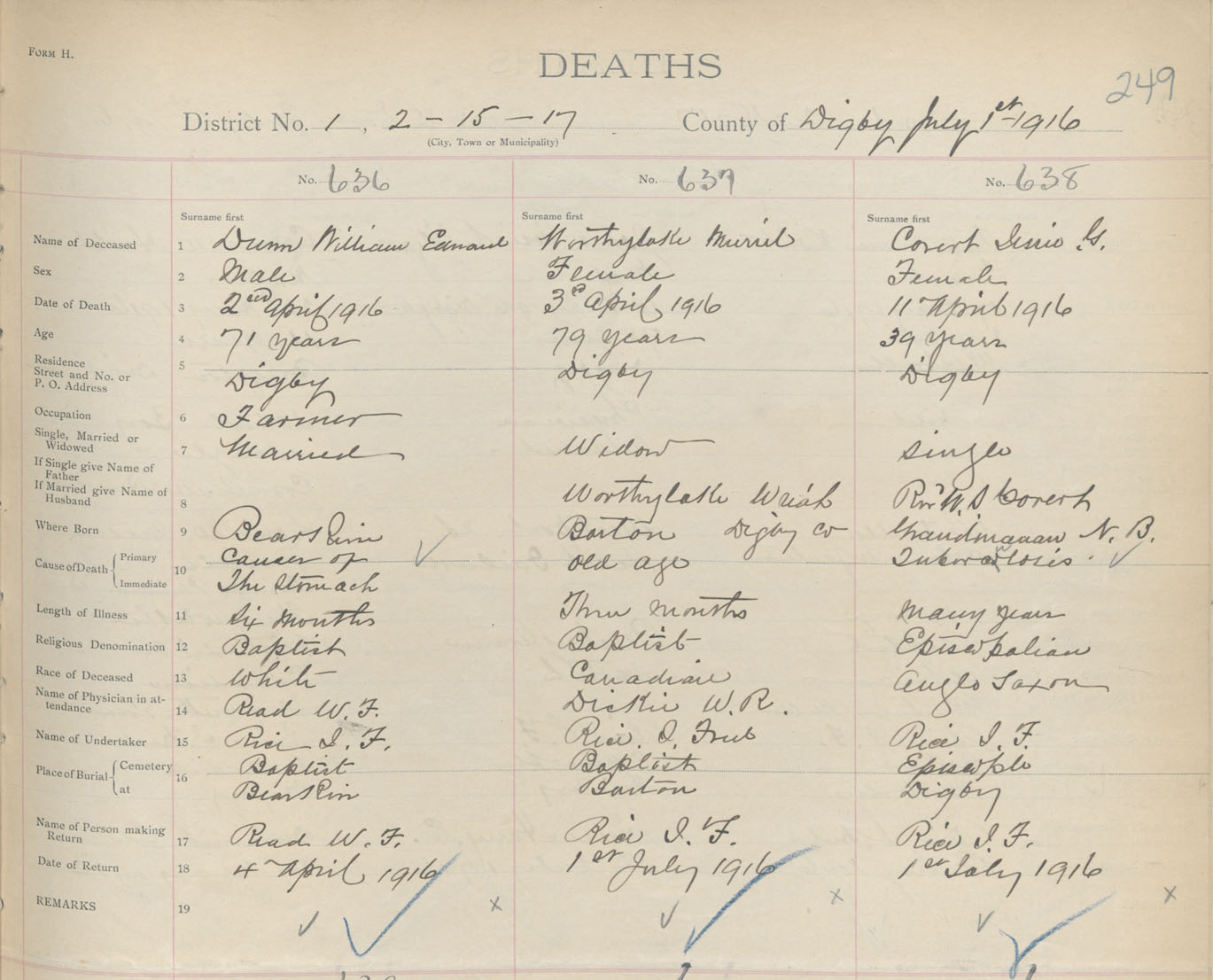 Female Death Registration: Year: 1916 book: 33 page: 249 number: 638