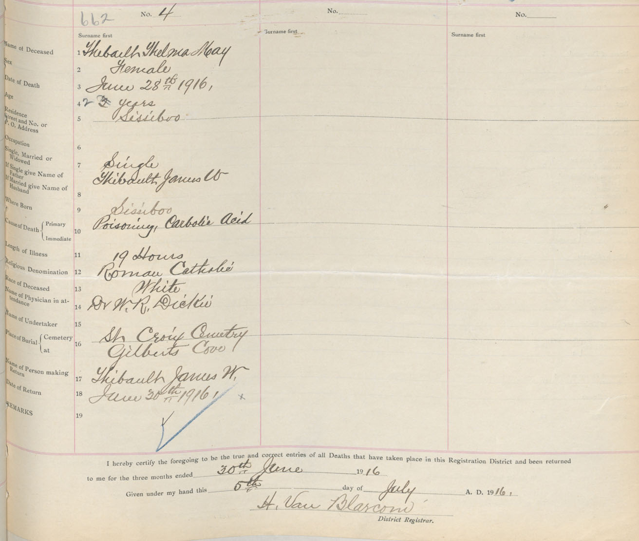 Female Death Registration: Year: 1916 book: 33 page: 255 number: 662