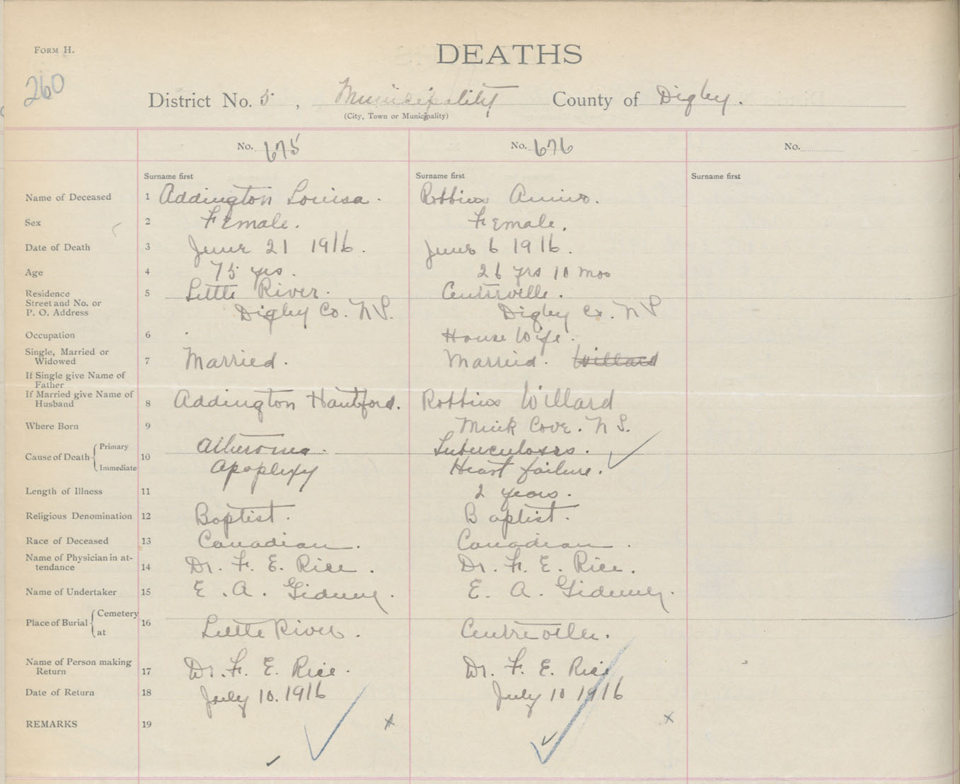 Female Death Registration: Year: 1916 book: 33 page: 260 number: 676