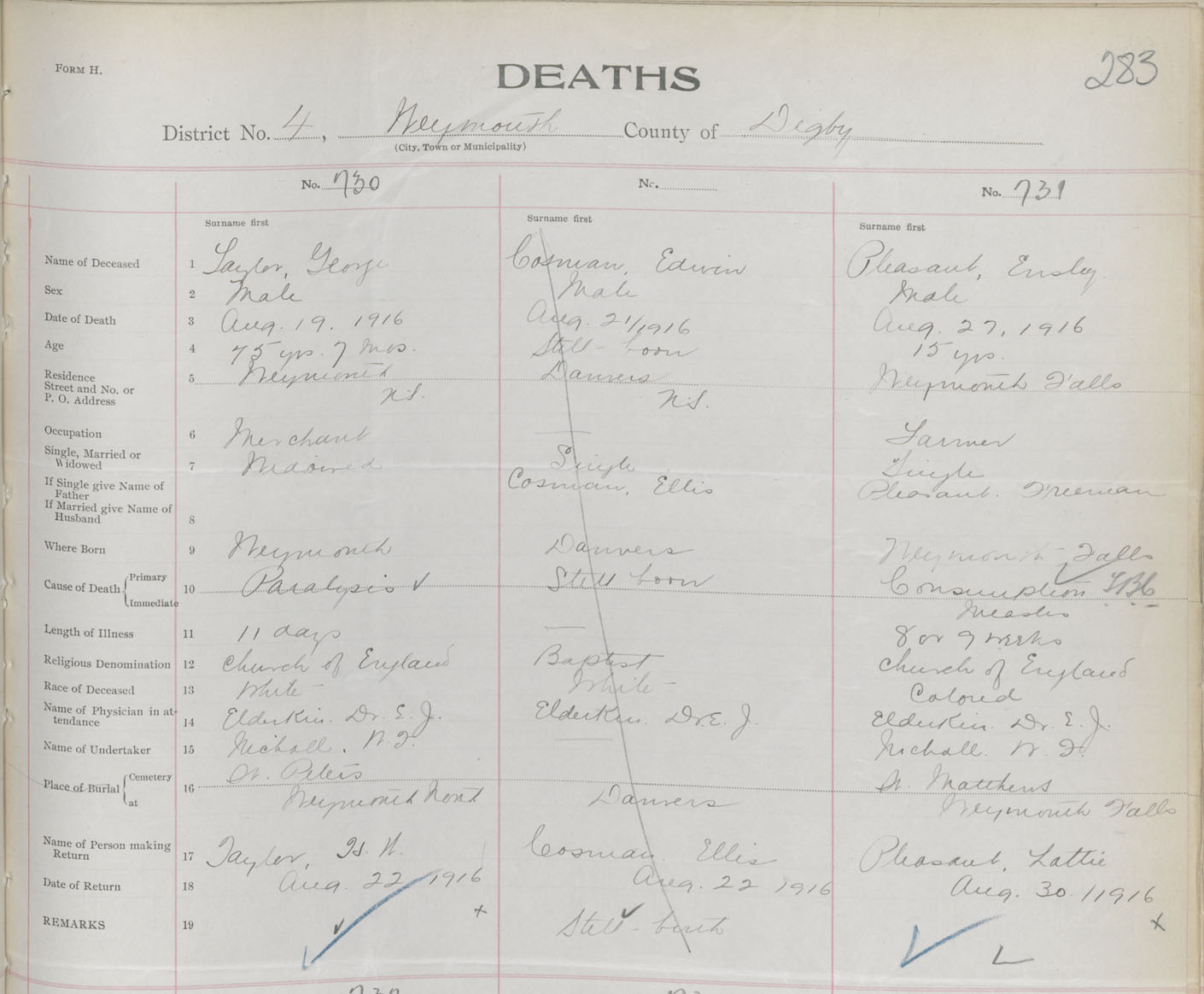 Male Death Registration: Year: 1916 book: 33 page: 283 number: 731