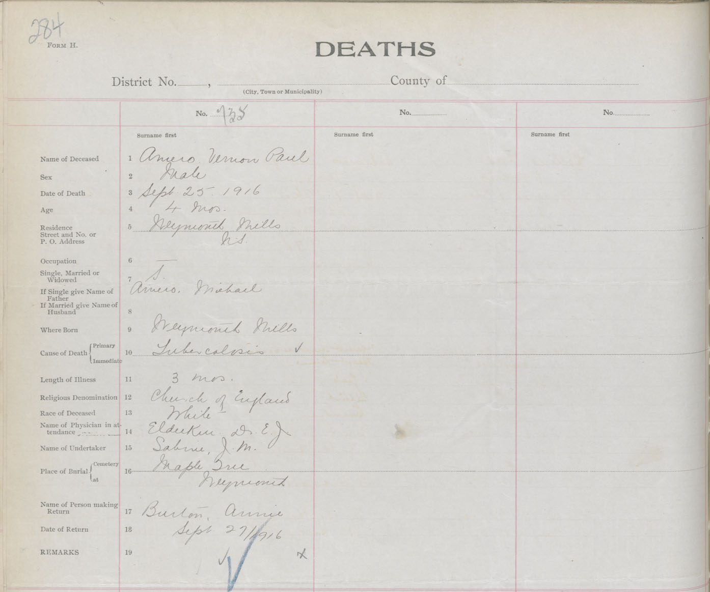 Male Death Registration: Year: 1916 book: 33 page: 284 number: 735