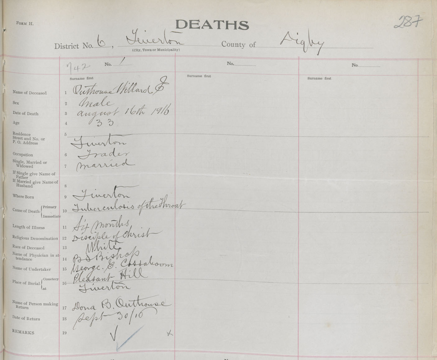 Male Death Registration: Year: 1916 book: 33 page: 287 number: 742