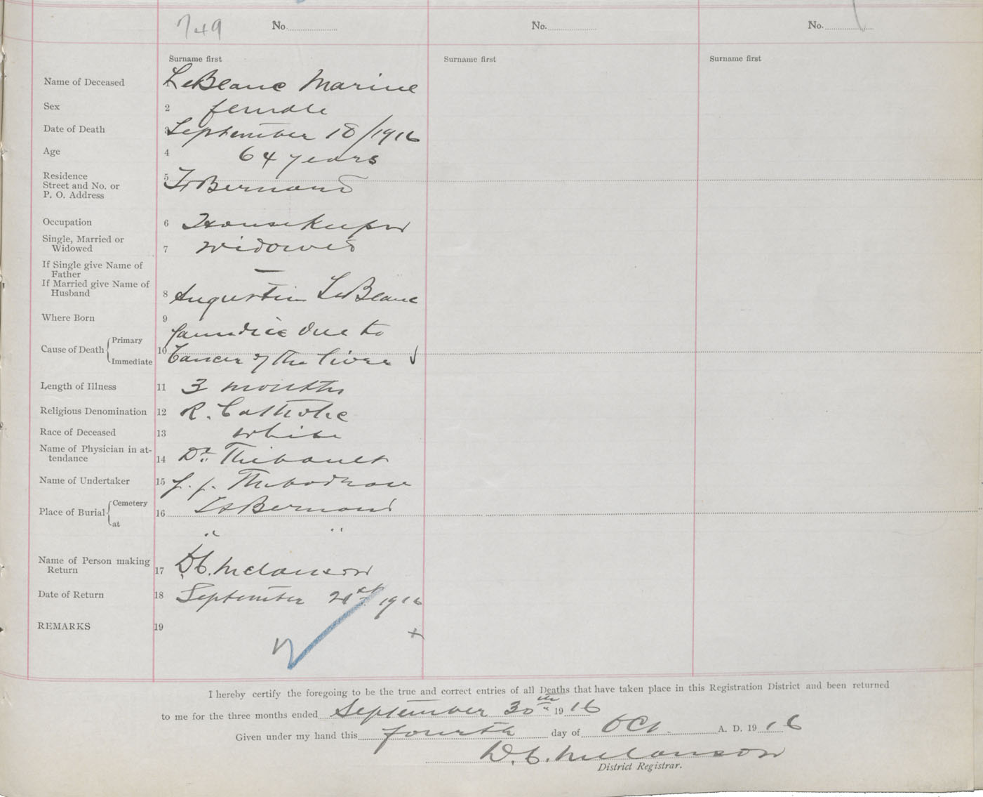 Female Death Registration: Year: 1916 book: 33 page: 291 number: 749