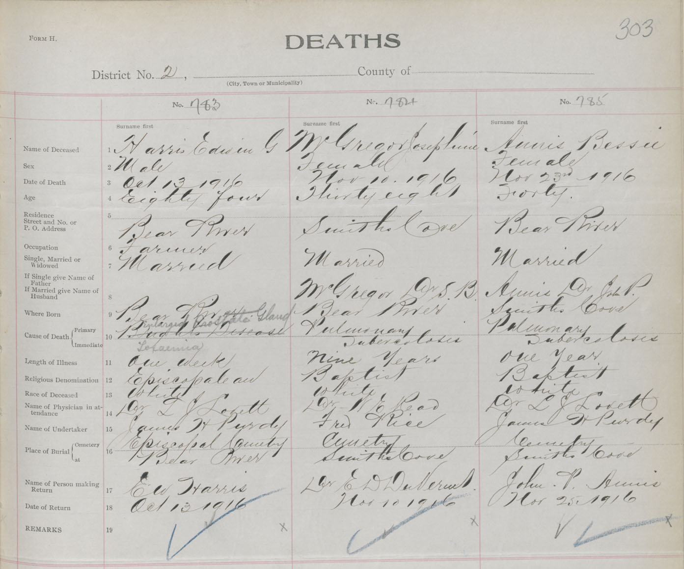 Female Death Registration: Year: 1916 book: 33 page: 303 number: 785