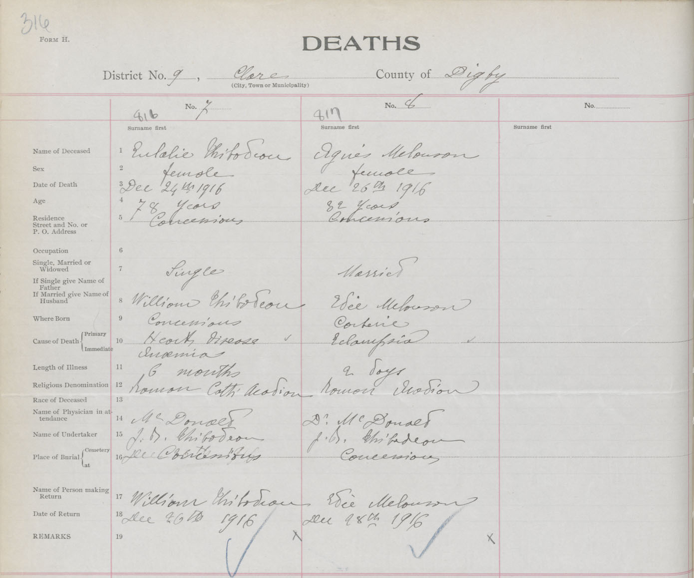 Female Death Registration: Year: 1916 book: 33 page: 316 number: 816