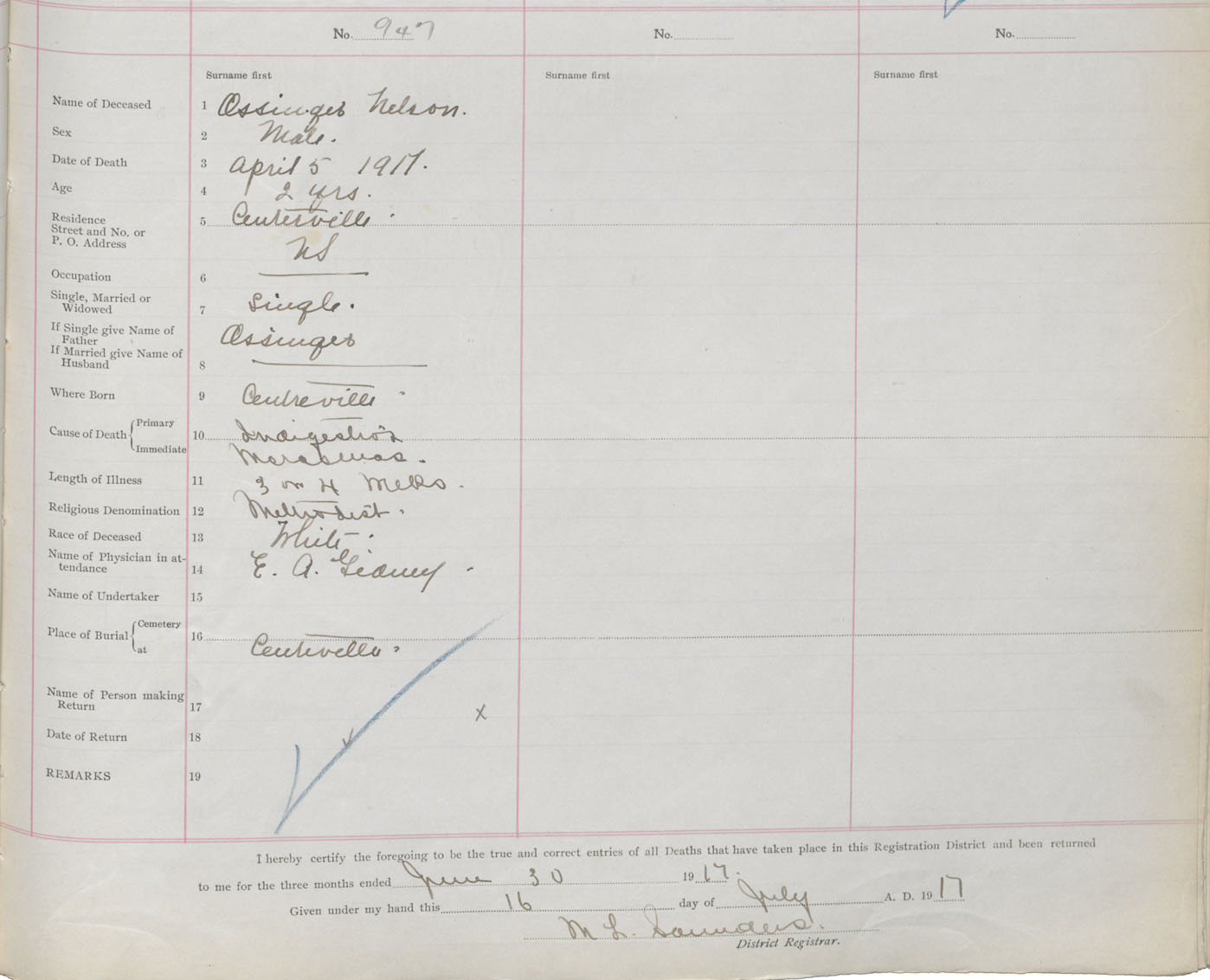 Male Death Registration: Year: 1917 book: 33 page: 359 number: 947