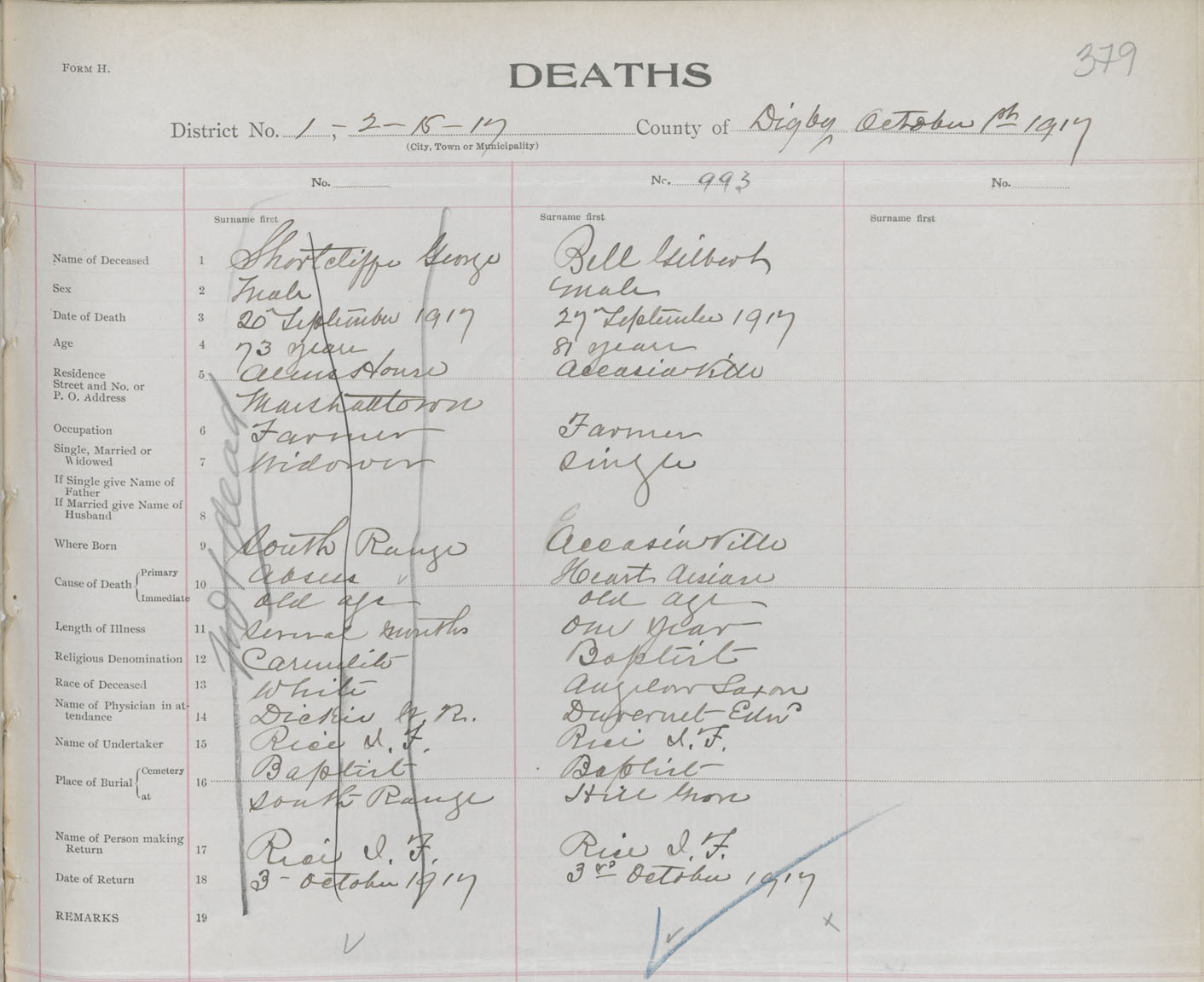 Male Death Registration: Year: 1917 book: 33 page: 379 number: 993