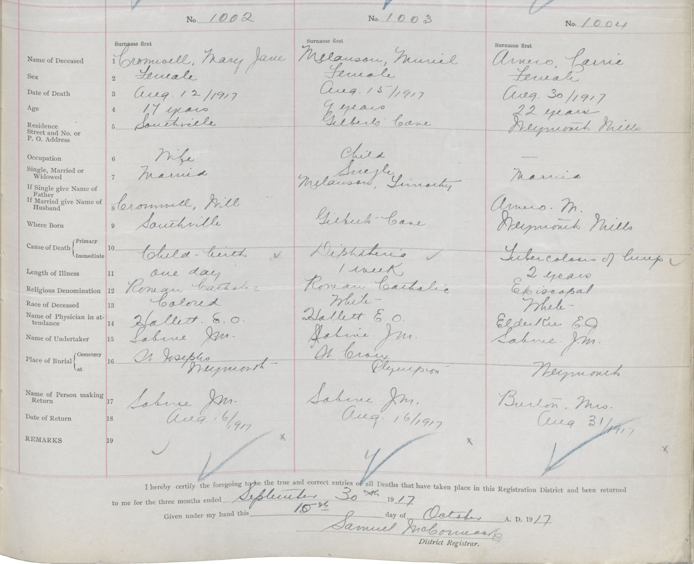 Female Death Registration: Year: 1917 book: 33 page: 383 number: 1002
