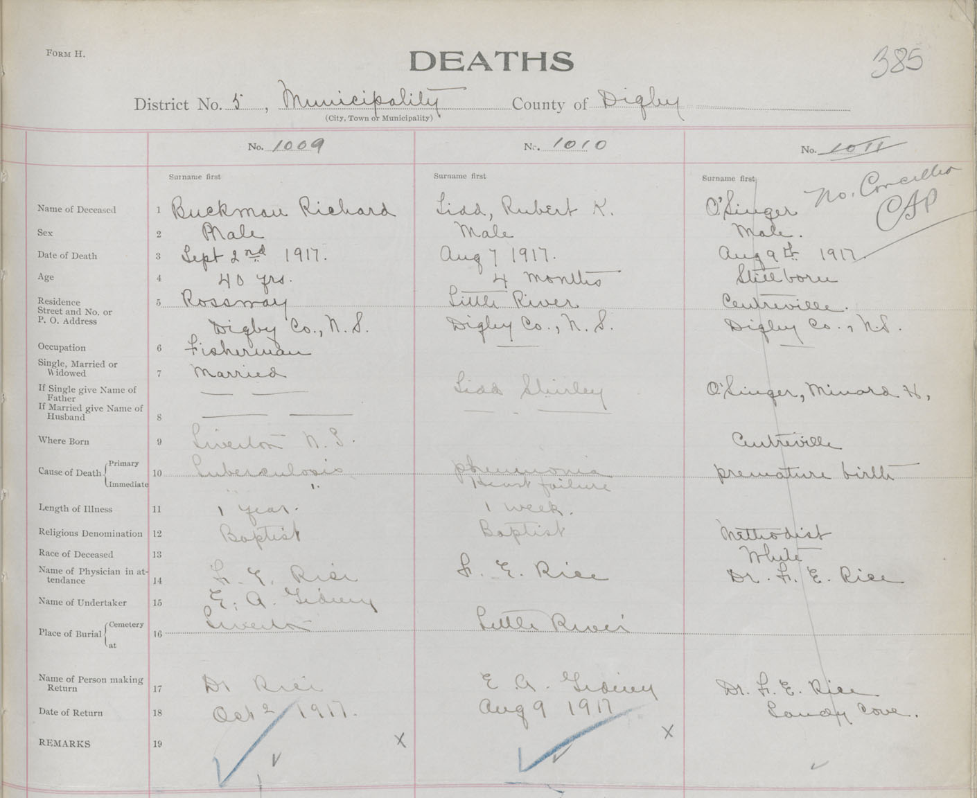 Male Death Registration: Year: 1917 book: 33 page: 385 number: 1009