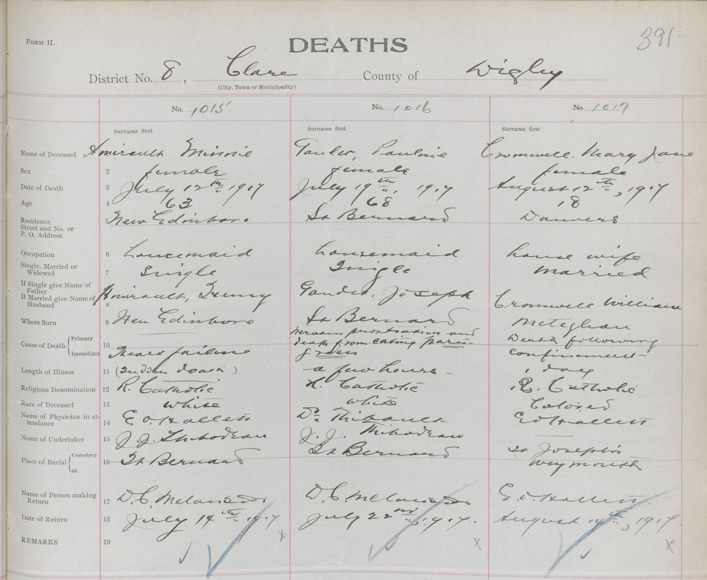 Female Death Registration: Year: 1917 book: 33 page: 391 number: 1015