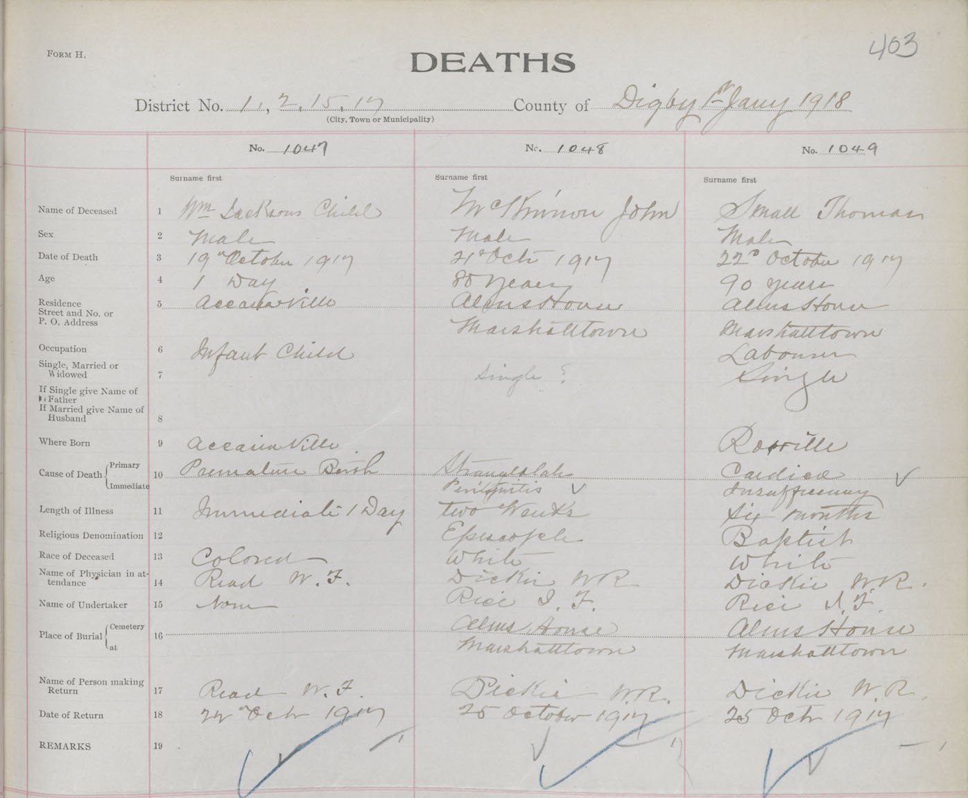 Male Death Registration: Year: 1917 book: 33 page: 403 number: 1047