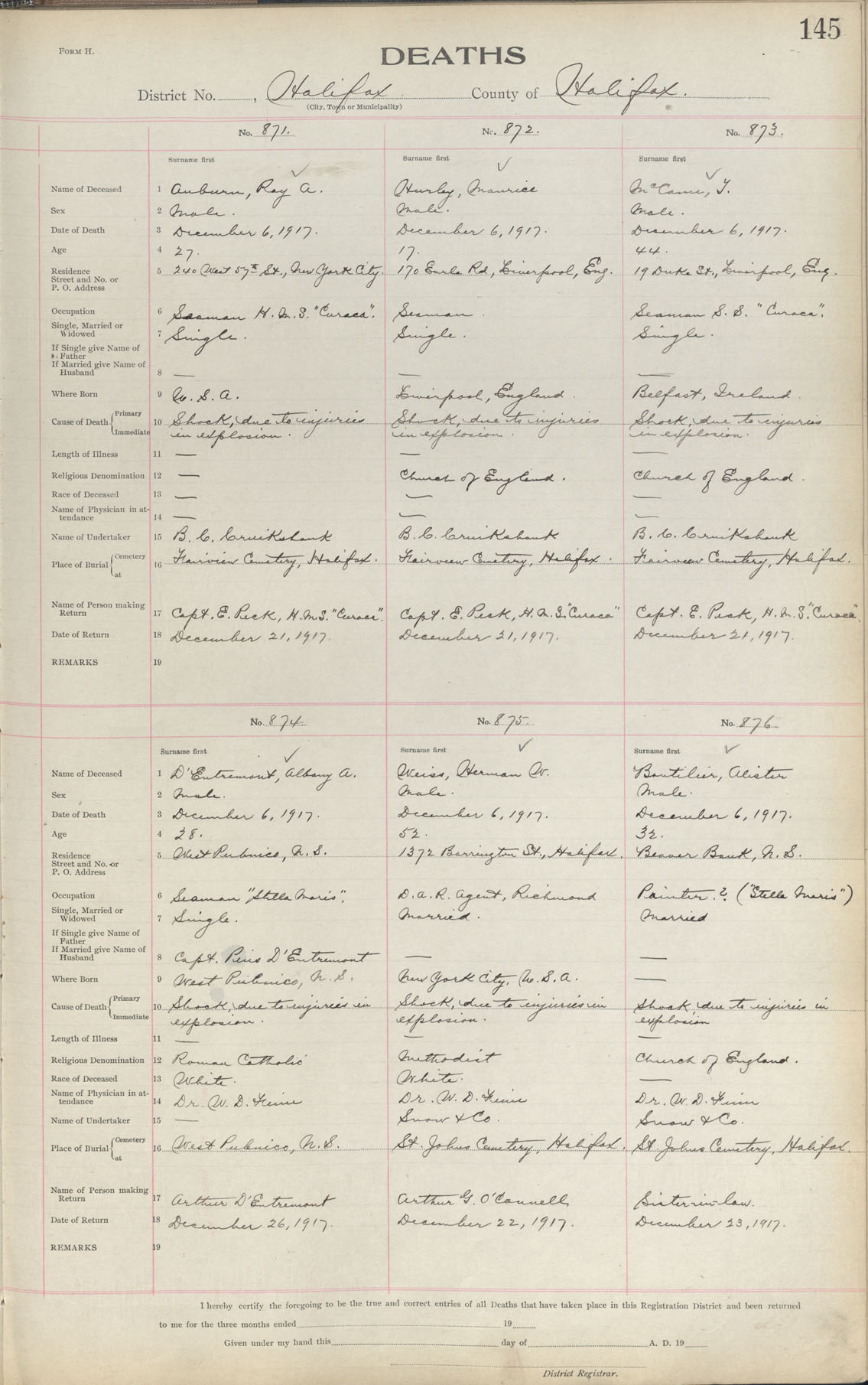 Male Death Registration: Year: 1917 book: 1917 page: 145 number: 876