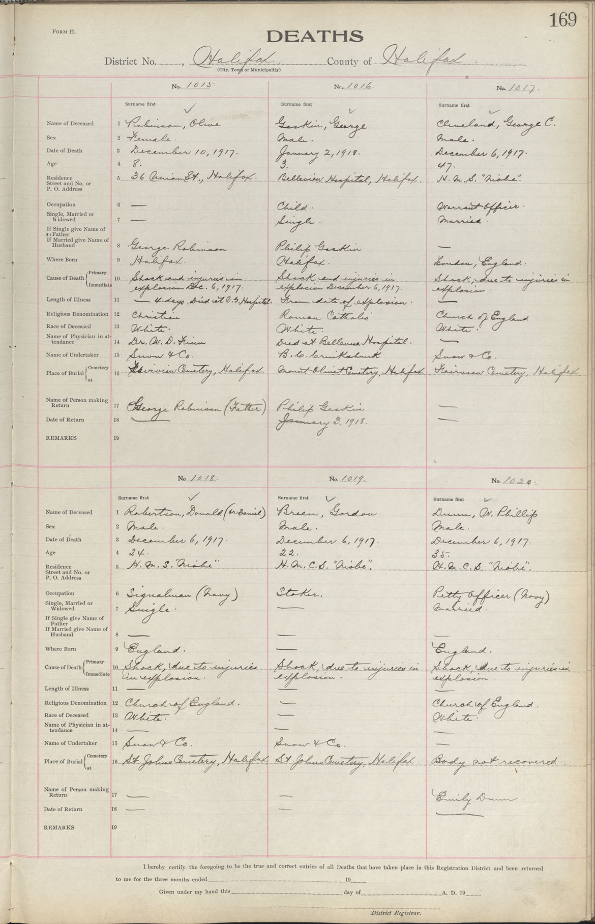 Female Death Registration: Year: 1917 book: 1917 page: 169 number: 1015