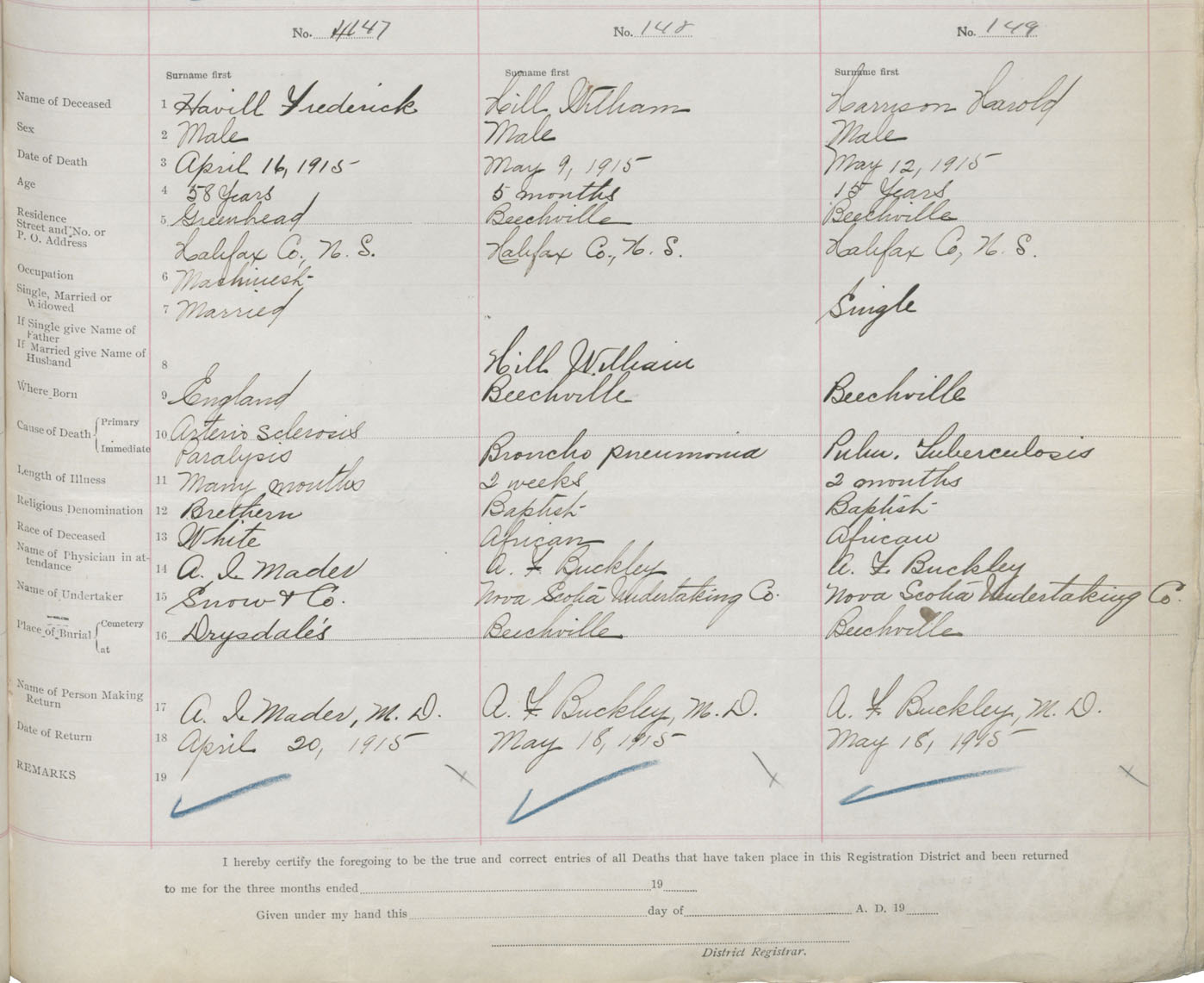 Male Death Registration: Year: 1915 book: 34 page: 43 number: 149