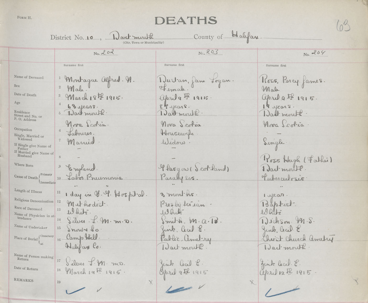 Male Death Registration: Year: 1915 book: 34 page: 63 number: 204