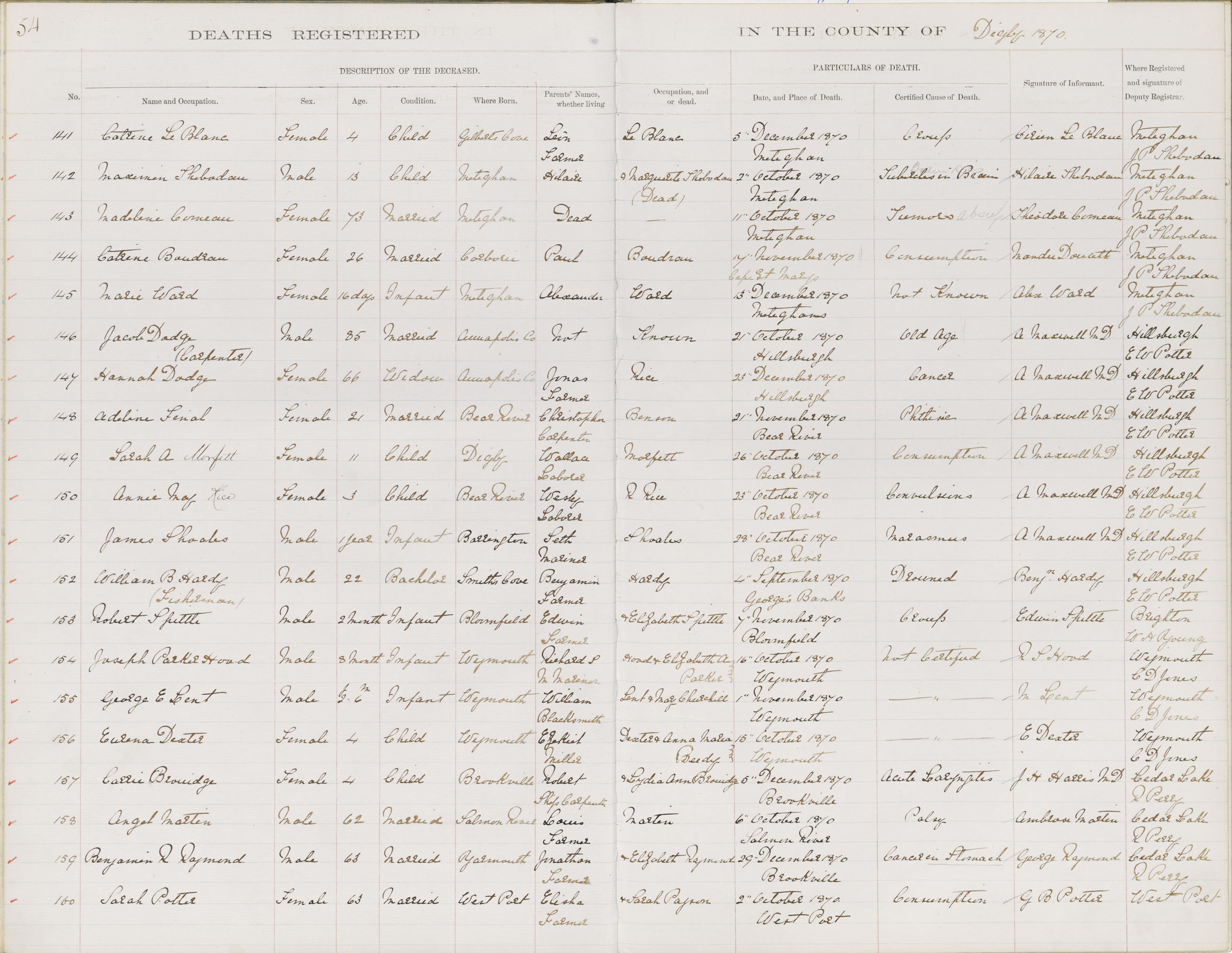 Female Death Registration: Year: 1870 book: 1806 page: 54 number: 160