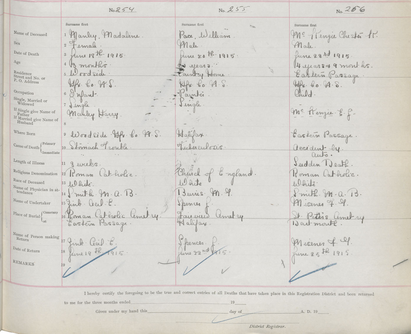 Male Death Registration: Year: 1915 book: 34 page: 73 number: 256