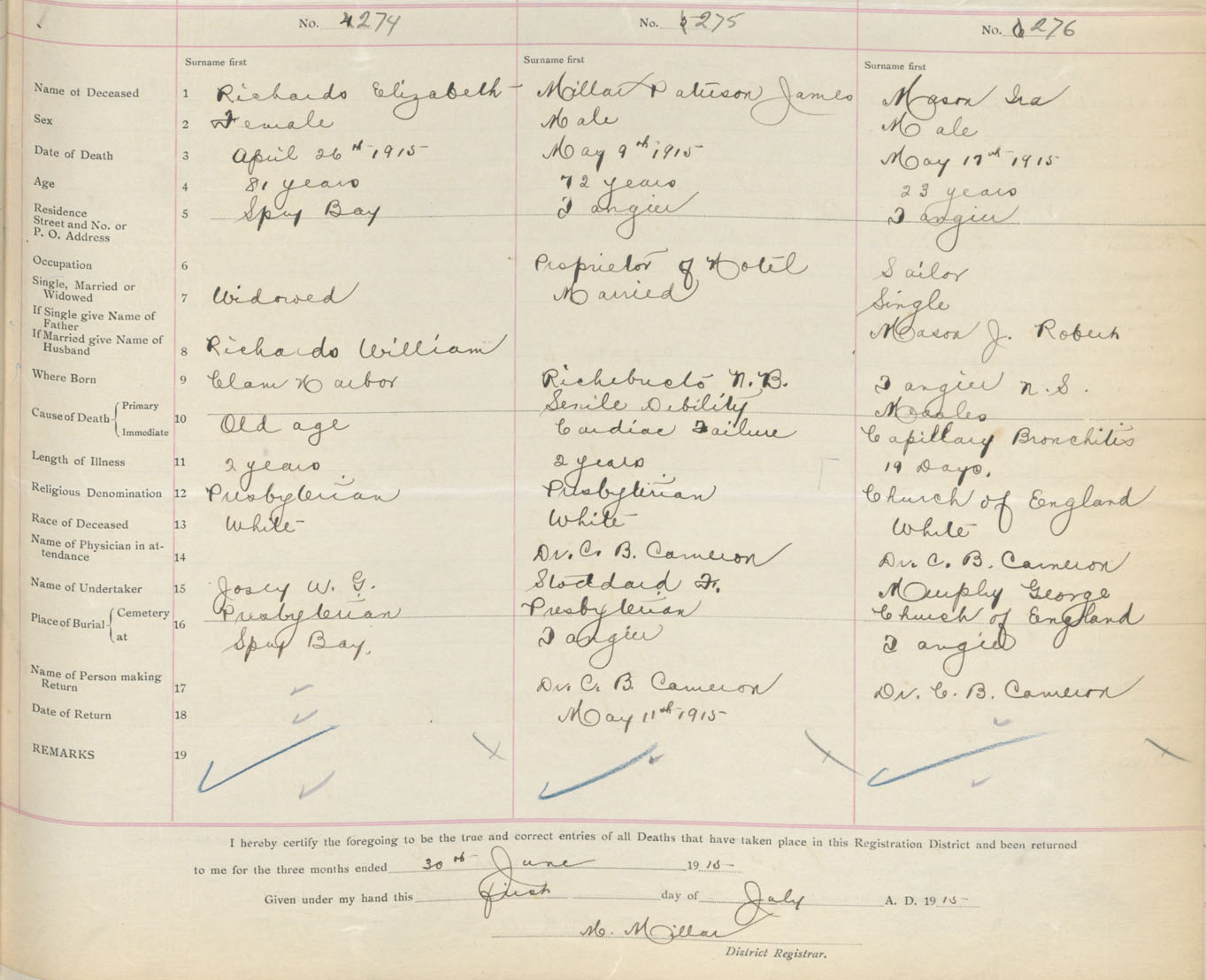 Male Death Registration: Year: 1915 book: 34 page: 79 number: 276