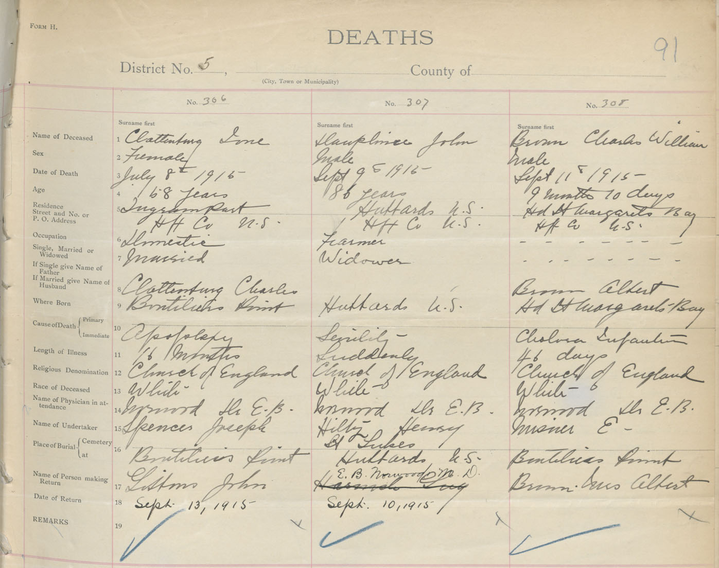 Male Death Registration: Year: 1915 book: 34 page: 91 number: 308