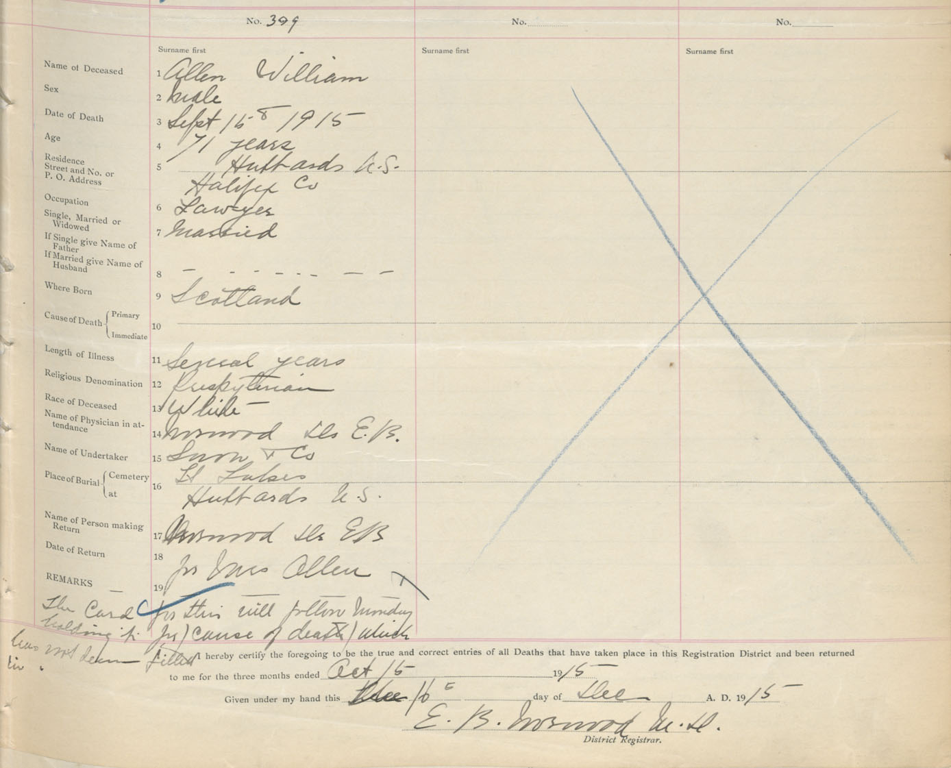 Male Death Registration: Year: 1915 book: 34 page: 91 number: 309