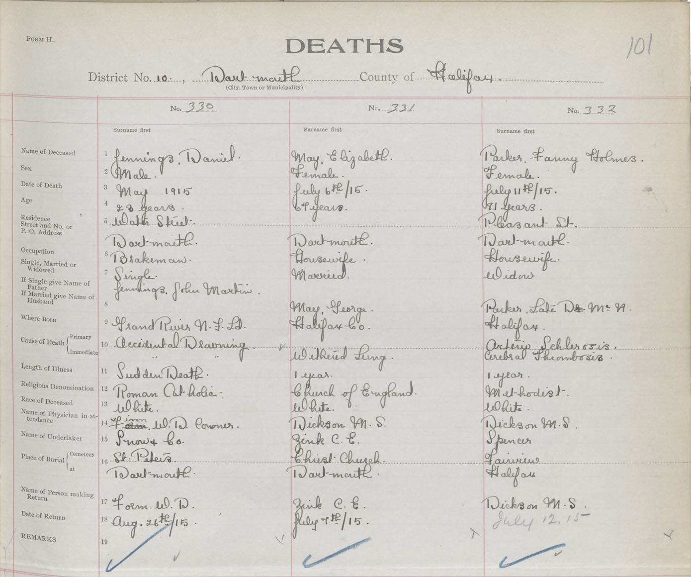 Female Death Registration: Year: 1915 book: 34 page: 101 number: 332