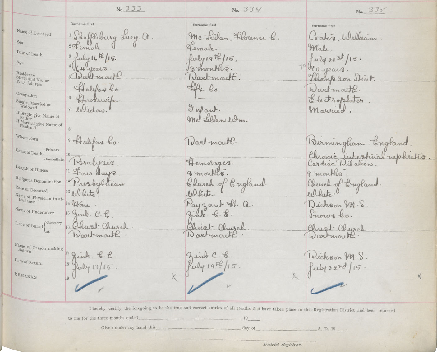 Male Death Registration: Year: 1915 book: 34 page: 101 number: 335