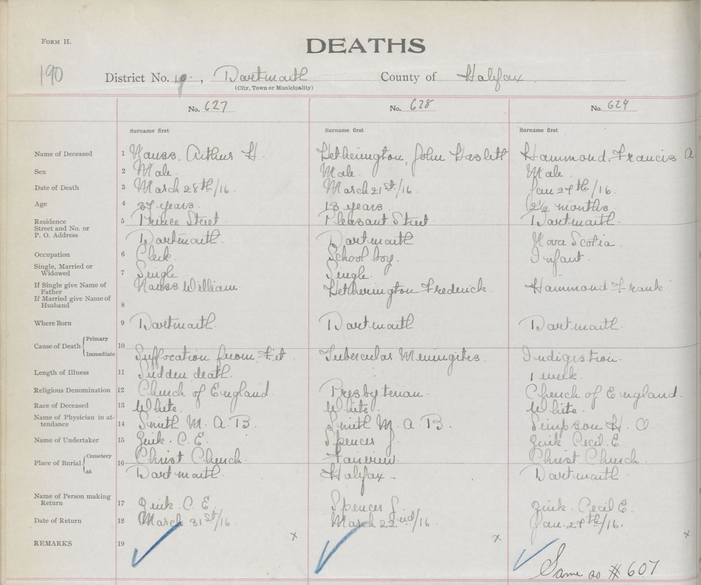 Male Death Registration: Year: 1916 book: 34 page: 190 number: 629