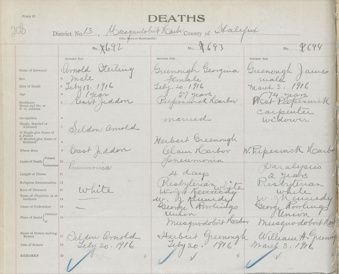 Male Death Registration: Year: 1916 book: 34 page: 208 number: 692