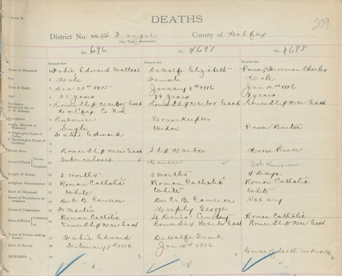 Male Death Registration: Year: 1915 book: 34 page: 209 number: 696