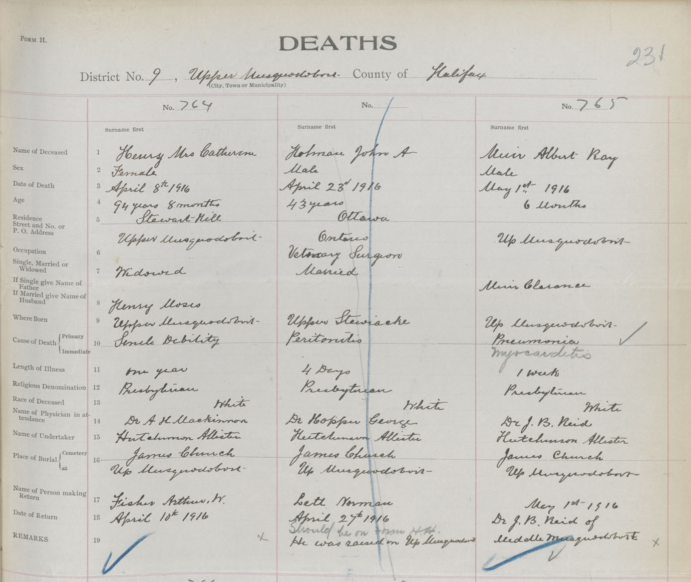 Male Death Registration: Year: 1916 book: 34 page: 231 number: 765