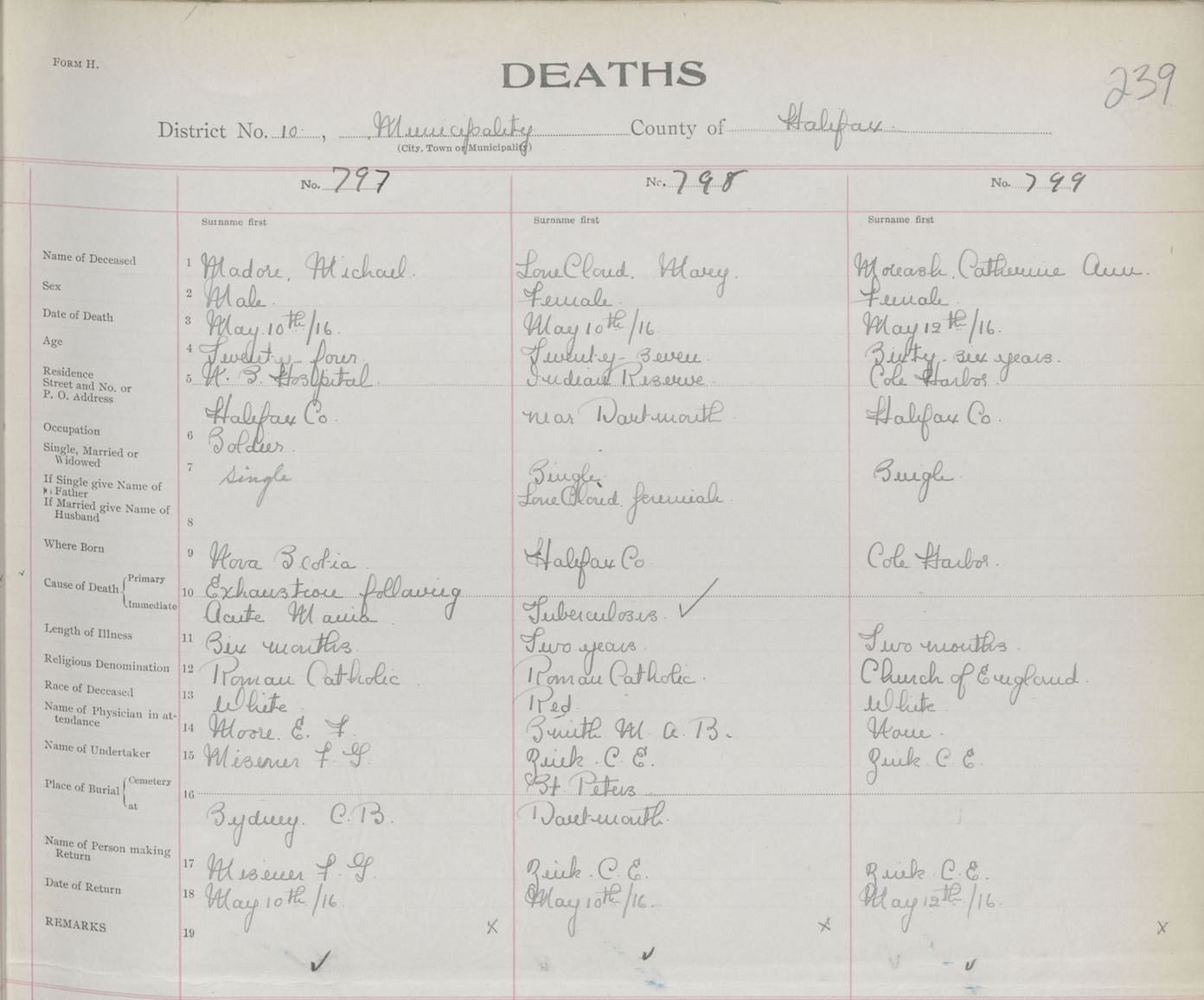 Female Death Registration: Year: 1916 book: 34 page: 239 number: 799