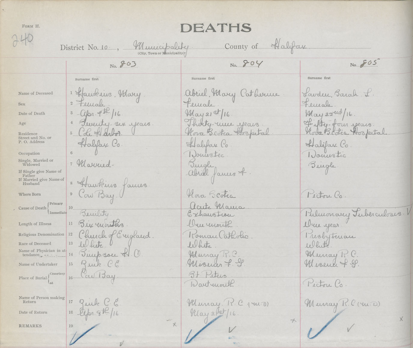 Female Death Registration: Year: 1916 book: 34 page: 240 number: 805
