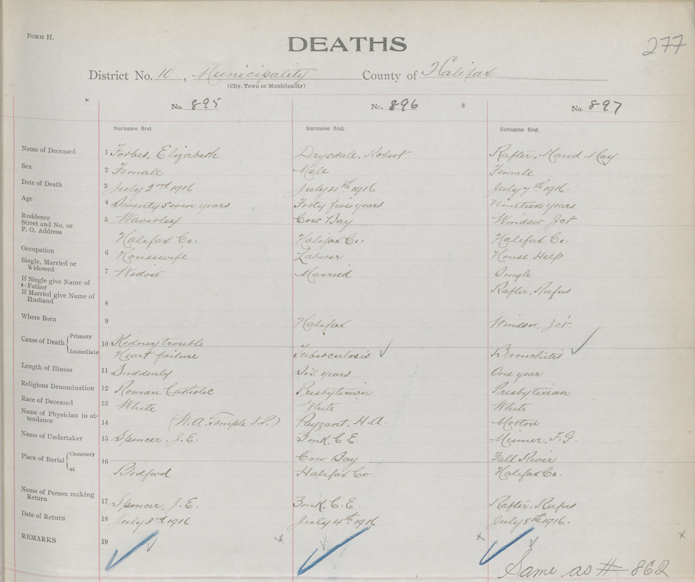 Female Death Registration: Year: 1916 book: 34 page: 277 number: 897