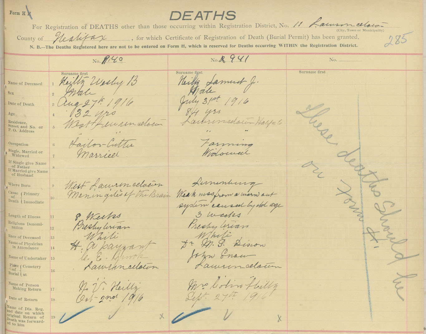 Male Death Registration: Year: 1916 book: 34 page: 285 number: 941