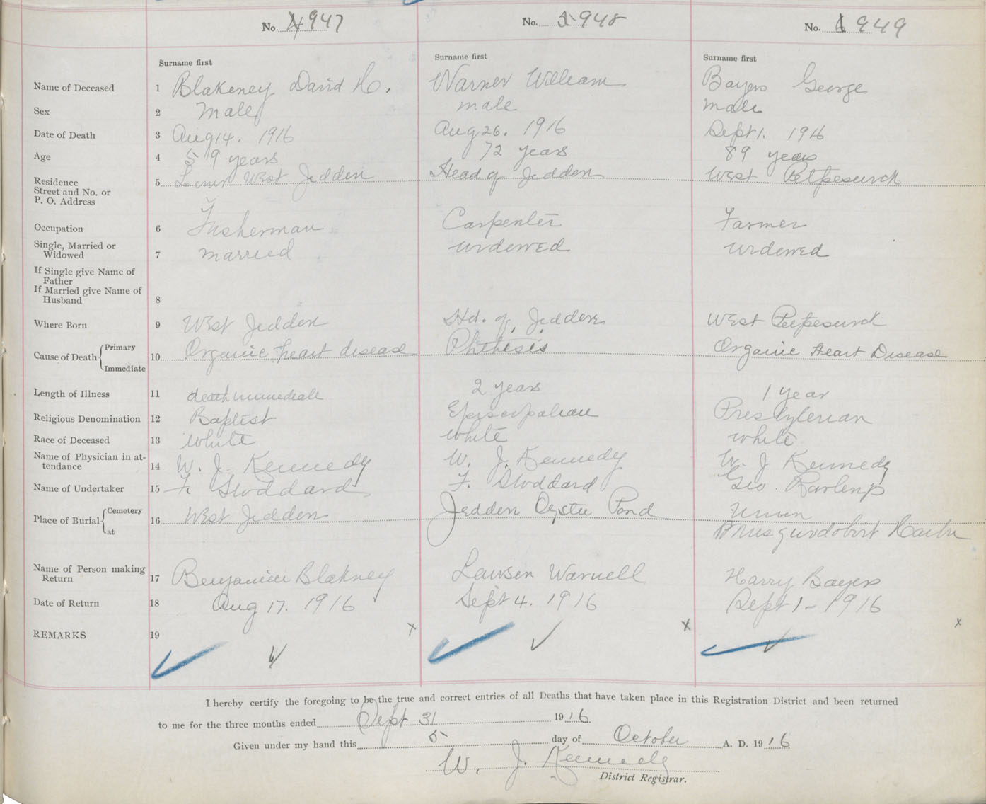 Male Death Registration: Year: 1916 book: 34 page: 289 number: 947